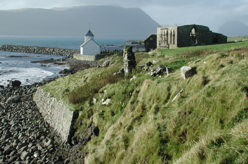 Kirkjubøur. Forrest i billedet ligger resterne af kirketomten Líkhús i den stærkt eroderende skrænt; rester af nordmuren stikker op af terrænnet. Længere mod vest ses den hvidkalkede middelalderlige sognekirke. Ved begge kirker vidner kystsikring om havets stadige nedbrydning af kysten og trussel mod monumenterne. Lidt tilbagetrukket fra kysten ligger domkirkeruinen, Múrurin, og vest for den ses gavlen af bondegården, der er opført på kældermure af bispegården. Foto: S. V. Arge 2002. |